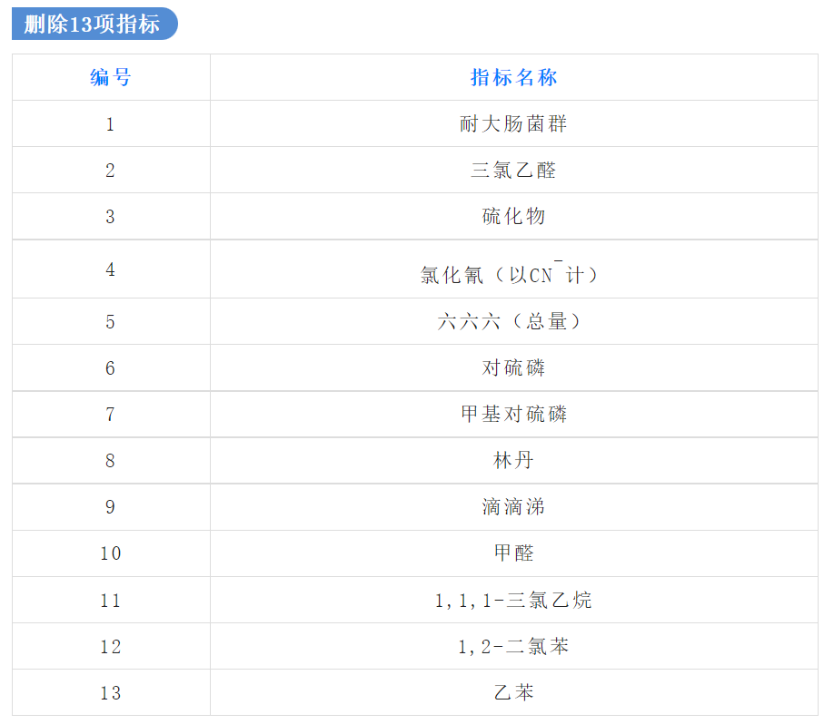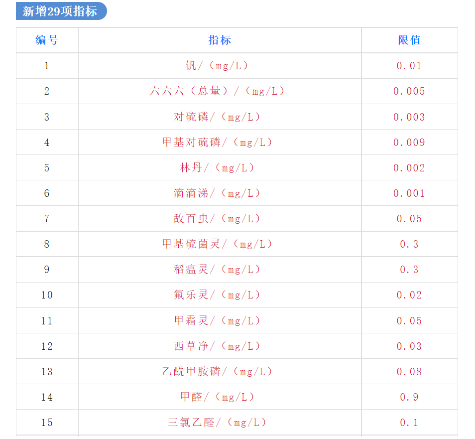 附錄 A(資料性)水(shuǐ)質參考指标由 GB 5749-2006的(de) 28項調整到(dào) 55項。其中新增了29項指标,包括釩、六六六(總量)、對硫磷、 甲基對硫磷、林丹、滴滴涕、敵百蟲、甲基硫茵靈、稻瘟靈、氟樂(yuè)靈、甲霜靈、西(xī)草(cǎo)淨、乙酰甲胺磷、甲醛、三氯乙醛、氯化氰(以CN-計(jì))、亞硝基二甲胺、碘乙酸、1,1,1-三氯乙烷、乙苯、1,2-二氯苯、全氟辛酸、全氟辛烷磺酸、二甲基二硫醚、二甲基三硫醚、碘化物(wù)、硫化物(wù)、鈾、鐳-226;删除了2項指标,包括 2-甲基異莰醇和(hé)土(tǔ)臭素;修改了 3項指标的(de)名稱,包括二溴乙烯名稱修改爲1,2-二溴乙烷、亞硝酸鹽名稱修改爲亞硝酸鹽(以N計(jì))、石棉(>10μm)名稱修改爲石棉(纖維>10μm);;調整了1項指标的(de)限值,爲石油類 (總量)。