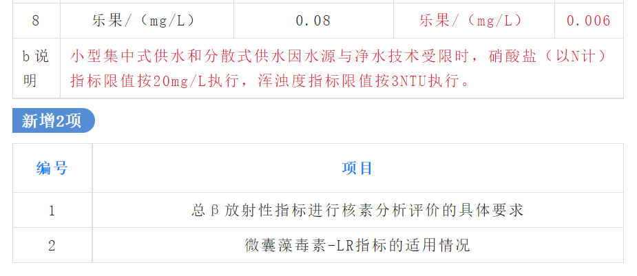 增加了總β放(fàng)射性指标進行(xíng)核素分(fēn)析評價前扣除⁴⁰K的(de)要求及微囊藻毒素-LR指标的(de)适用(yòng)情況。