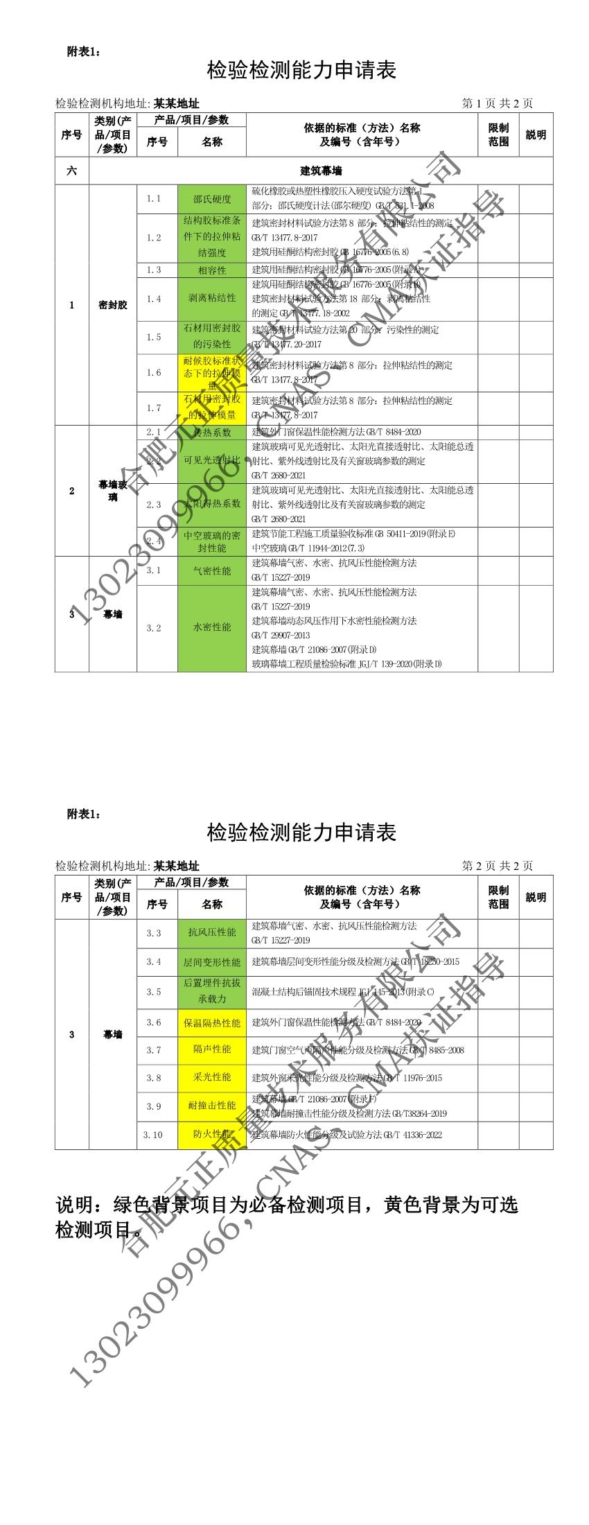 全國首版2023年《建設工(gōng)程質量檢測機構》CMA檢驗檢測能(néng)力申請表(第六部分(fēn):建築幕牆)