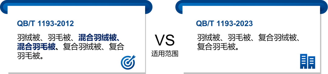 變化:明(míng)确了隻“适用(yòng)于羽絨被、羽毛被、複合羽絨被和(hé)複合羽毛被産品”,而“不适用(yòng)于羽絨羽毛和(hé)其他(tā)填充材料共混填充的(de)被類産品”。