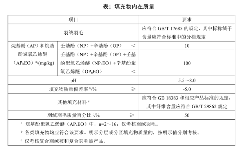 注:羽絨羽毛填充物(wù)應符合GB/T 17685的(de)規定,AP&APEO、pH、填充物(wù)質量偏差率、羽絨羽毛質量百分(fēn)比、其他(tā)填充材料應符合QB/T 1193-2023表1要求。