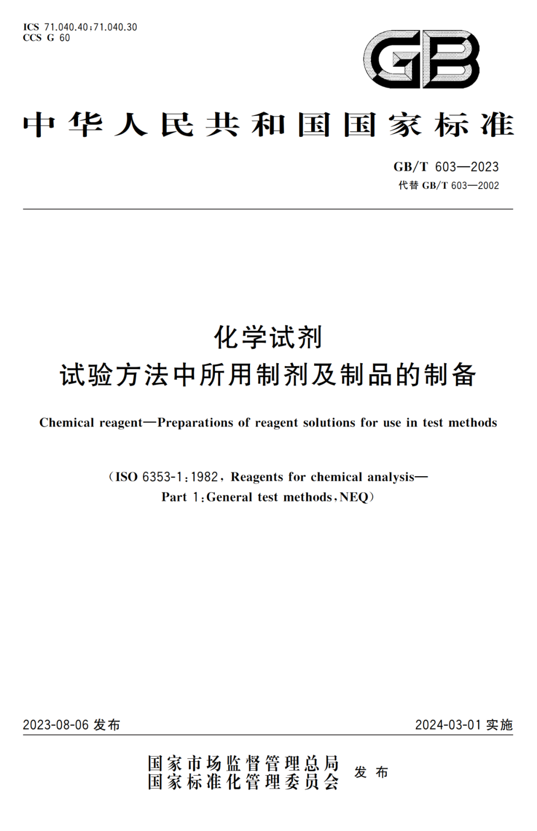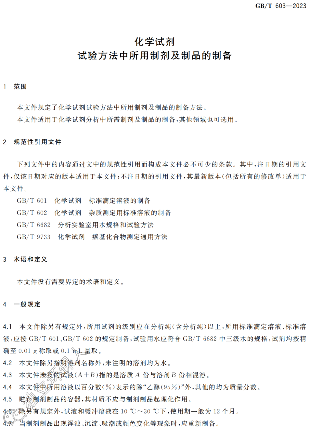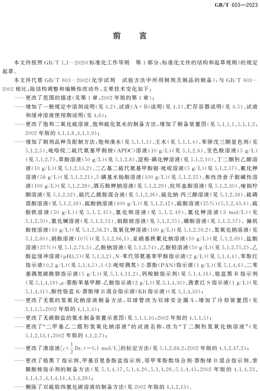 【重磅發布】GB/T 603-2023 化學試劑 試驗方法中所用(yòng)制(zhì)劑及制(zhì)品的(de)制(zhì)備(附全文(wén))