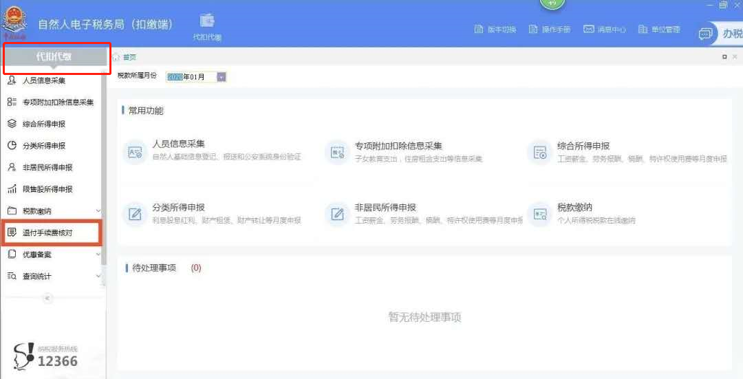 “代扣代繳”子目錄下進入【退付手續費核對】功能(néng)。